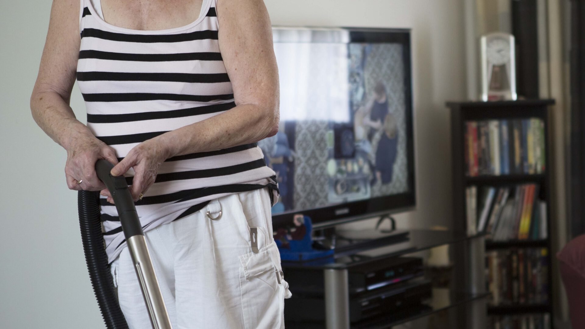 Foto bovenstaand: 65+er draagt de MISS Activity activiteitenmeter in haar broekzak tijdens haar dagelijkse beweegmomenten, ook tijdens het huishouden.